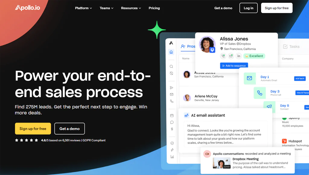 Apollo shines with its intuitive interface and AI-powered features like lead scoring and email personalization. This makes it easy for sales teams to identify and engage high-value prospects.