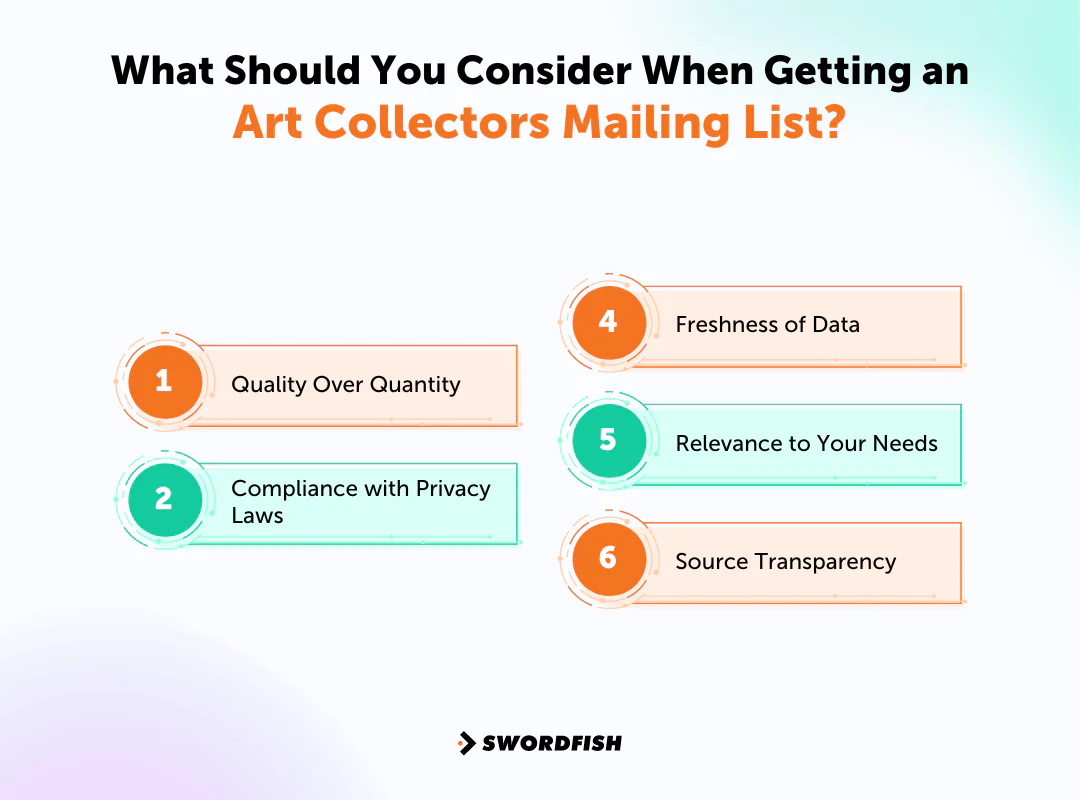 By keeping these factors in mind, you can select an art collectors mailing list that aids in your marketing strategies.Here are some factors to make sure you’re making the best choice –