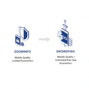Outcome-first ZoomInfo vs Swordfish comparison focused on right-party connects, credits vs unlimited behavior, data decay, integration headaches, and a test plan using your own list.