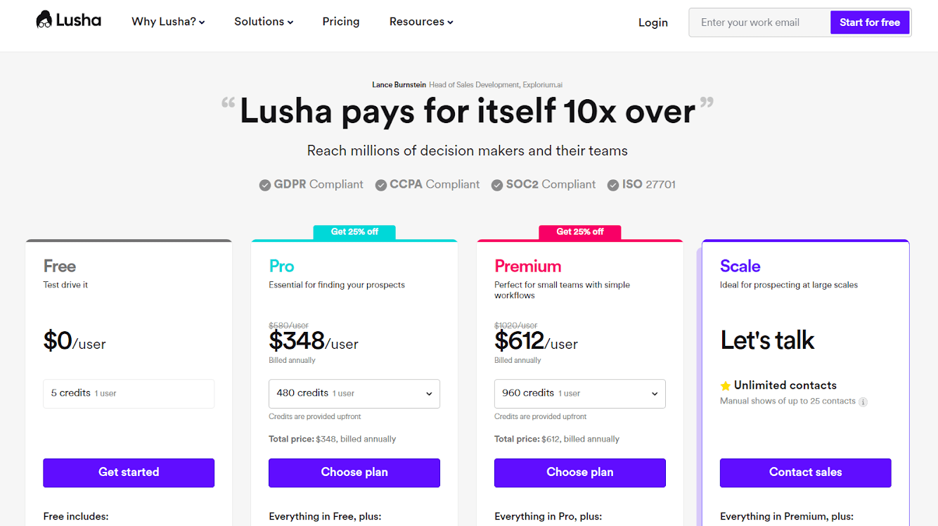 Lusha offers a free trial and a range of affordable monthly plans starting at $0 (free) and going up to $69, depending on the number of credits you select. This pricing structure allows businesses of all sizes to access the benefits of their services.
