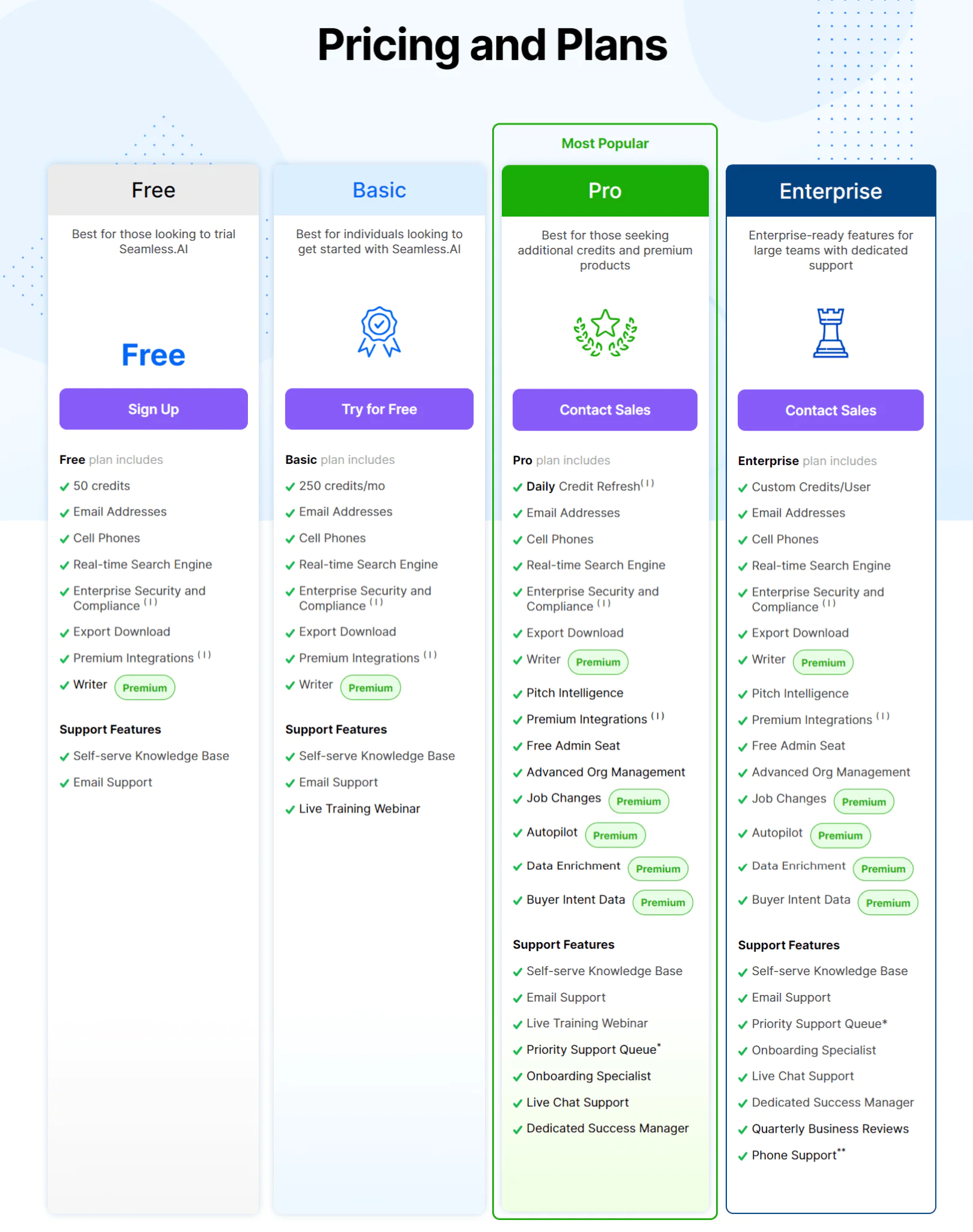 Seamless.AI gives you 50 free credits. Which means you will be able to explore its services without an upfront cost. This offer is particularly advantageous for small businesses or individuals beginning their journey.