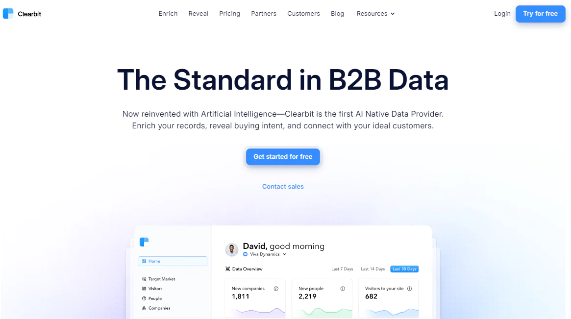 Clearbit presents itself as the standard in B2B data, now enhanced with Artificial Intelligence. It’s the first AI Native Data Provider, aiming to enrich records, reveal buying intent, and facilitate connections with ideal customers.